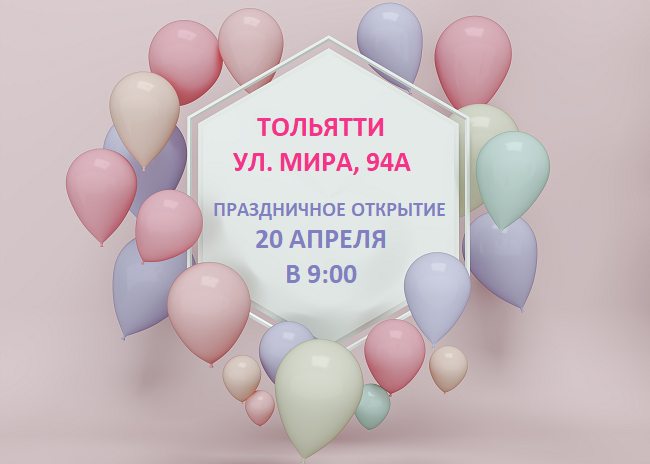 20 апреля в 9:00 ПРАЗДНИЧНОЕ ОТКРЫТИЕ магазина в г. Тольятти!<br /> <br /> ПОДАРКИ всем покупателям!<br /> <br /> Адрес магазина:<br /> ул. Мира, 94А,<br /> Остановка транспорта - Дом природы<br />