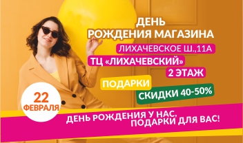 <h2><span style="color: #f16d7e;"><b>Праздник для нас - Скидки, подарки, сюрпризы для Вас!</b></span></h2> <b>22 февраля<br> </b><br> <i>Приглашаем на День Рождения магазина:</i><br> <br> <a href="https://planeta-sh.ru/contacts/stores/2215/">Московская область, г. Долгопрудный, Лихачевское шоссе, д.11А, ТЦ "Лихачевский", 2 этаж</a><span style="color: #f16d7e;"><b><br> </b></span>