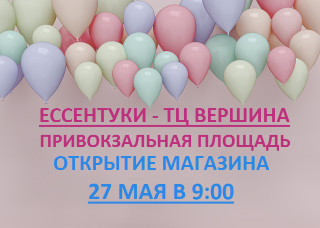 27 МАЯ в 9.00 ОТКРЫТИЕ НОВОГО МАГАЗИНА в г. ЕССЕНТУКИ, Привокзальная площадь, ТЦ Вершина!